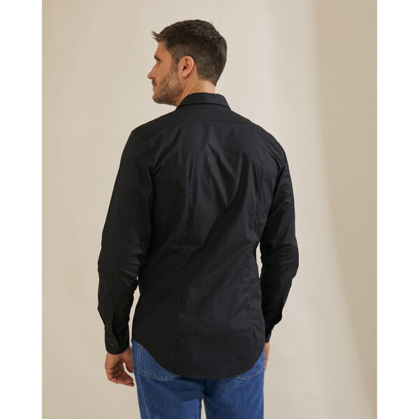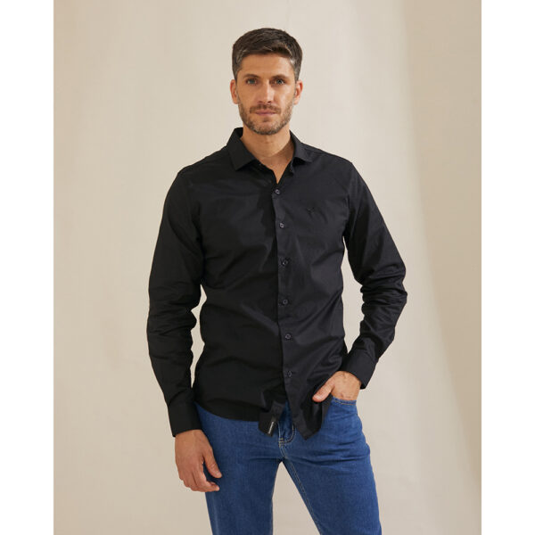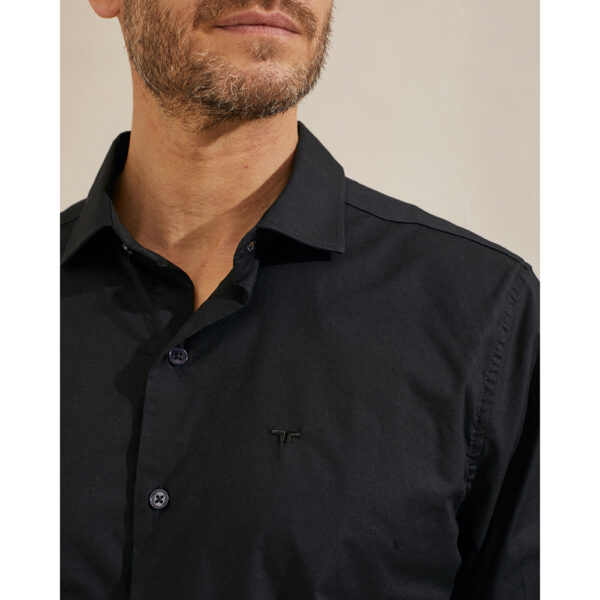 Camisa cuello corto, lisa de poplin elastizado, con logo bordado, sin bolsillos y cartera sin costuras. Calce entallado.