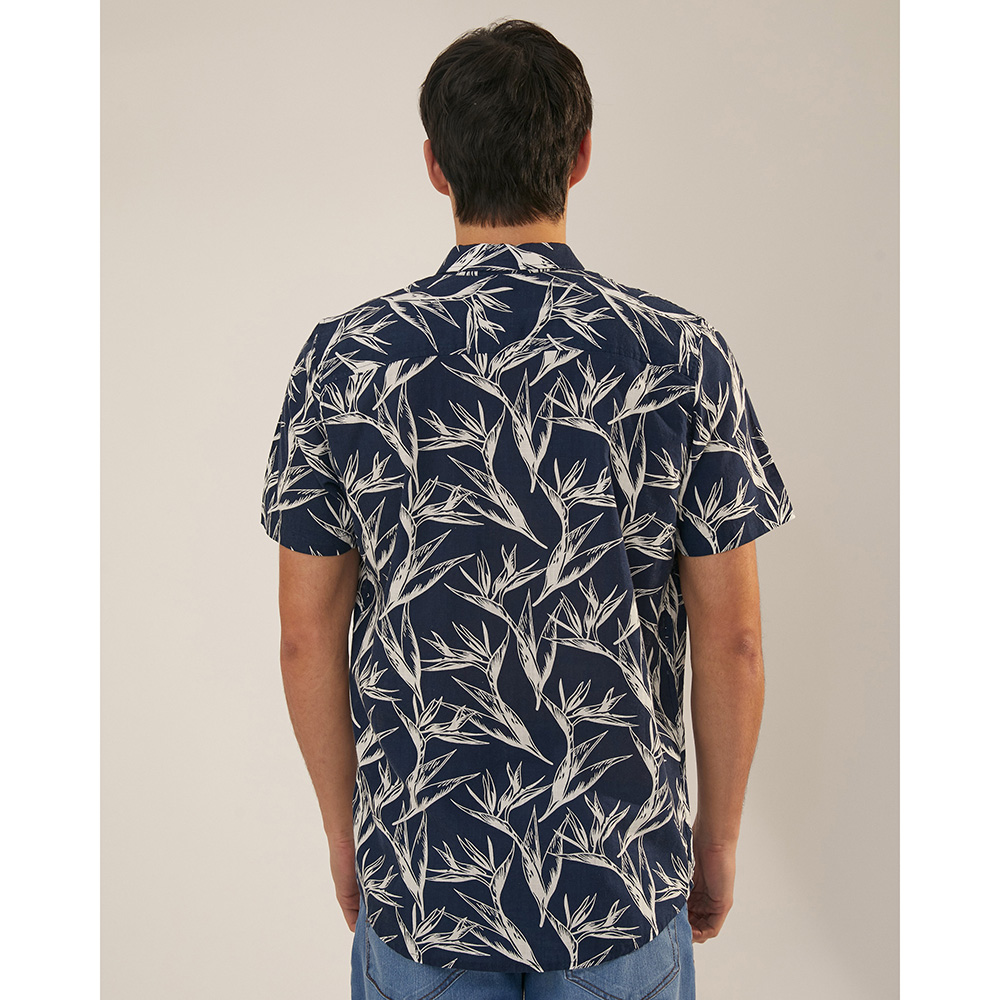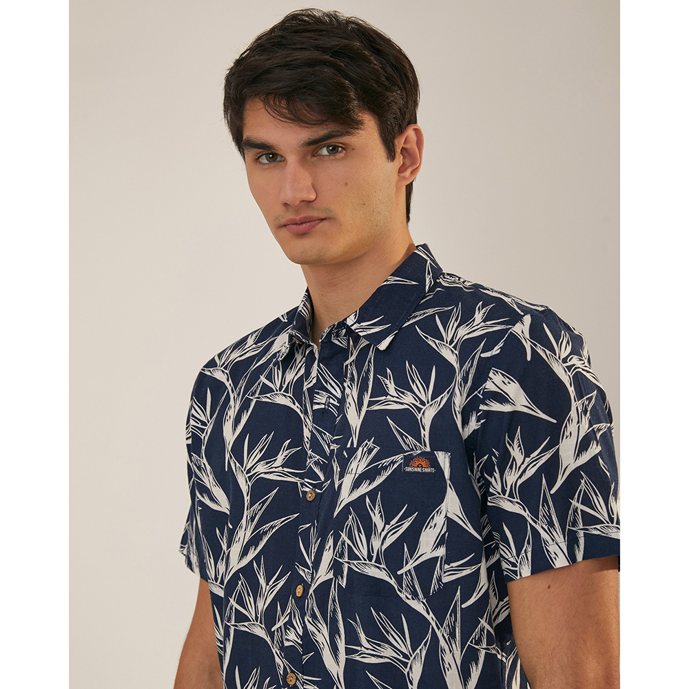 Camisa manga corta con bolsillo al frente. Tela lino estampado. Composición: 60% lino, 40% algodón.