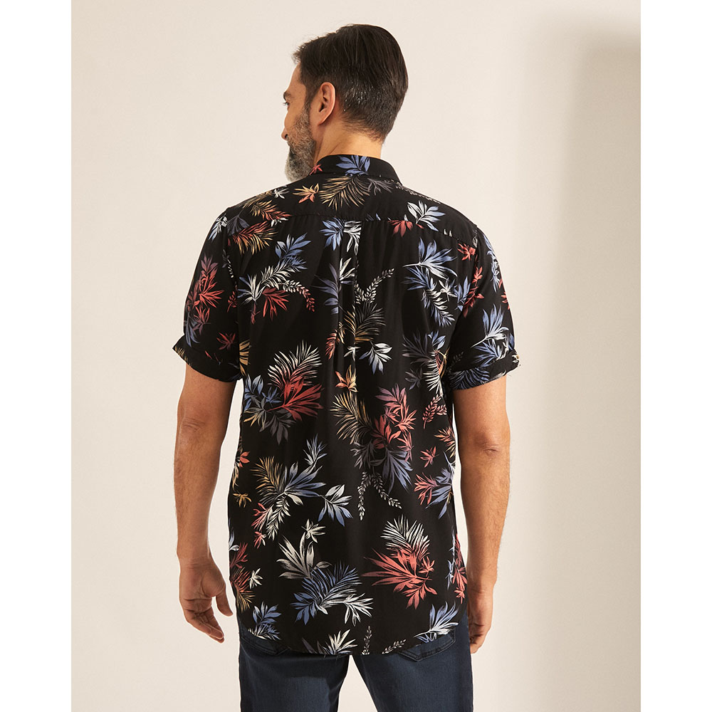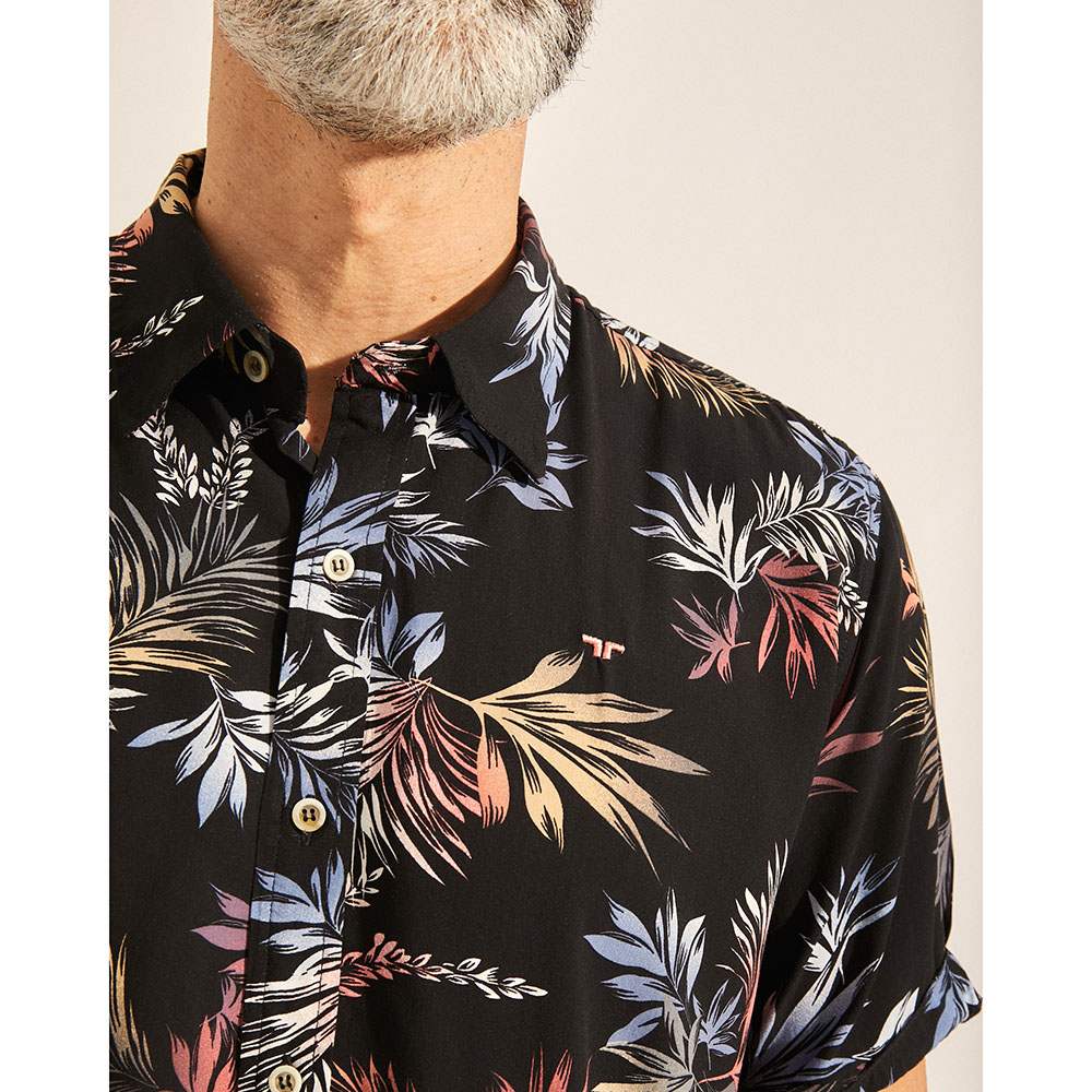 Camisa manga corta, estilo hawaiano, corte recto. Cuello clásico, botón en manga y bordado a contra color. Composición: 100% algodón.
