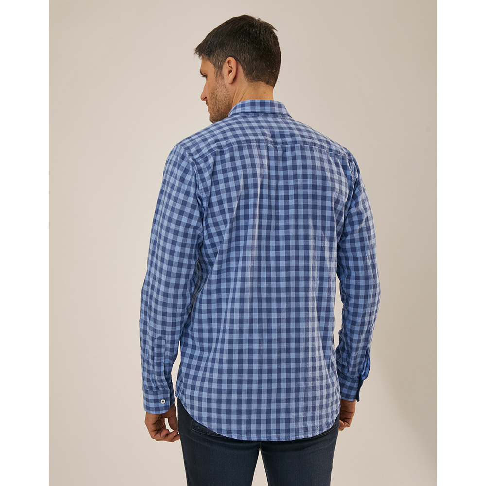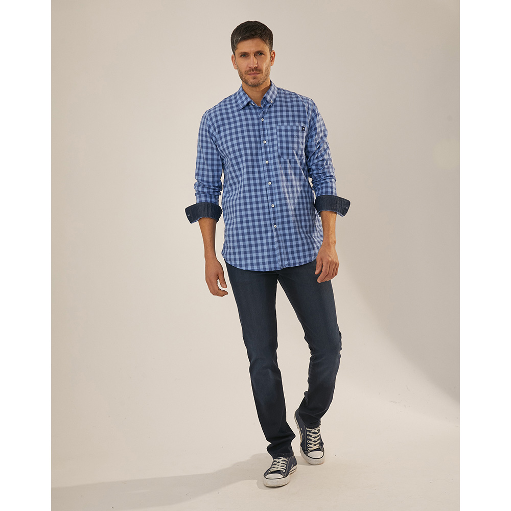 Camisa manga larga de calce clásico. Con bolsillo al frente y canesu interno combinado denim. Tela lino a cuadros. Composición: 60% lino, 40% algodón.