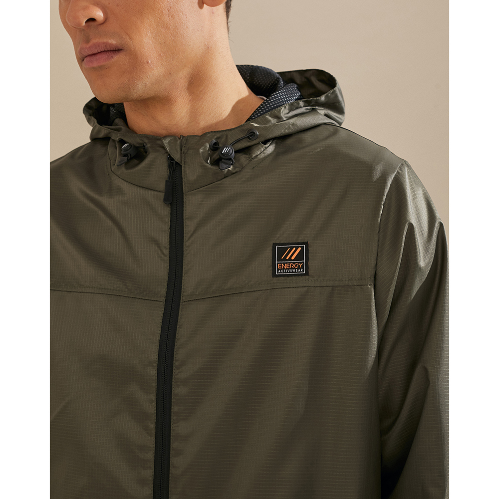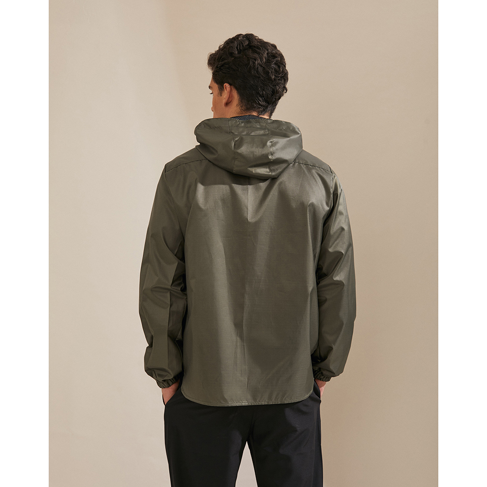 Campera liviana rompevientos con capucha regulable de cuello alto, en tejido impermeable con cierre central, bolsillos laterales con cierre, y recortes laterales en red.