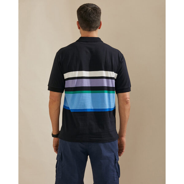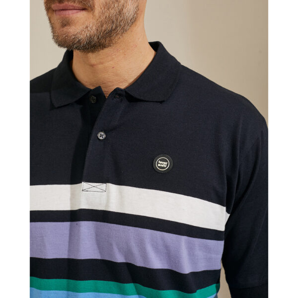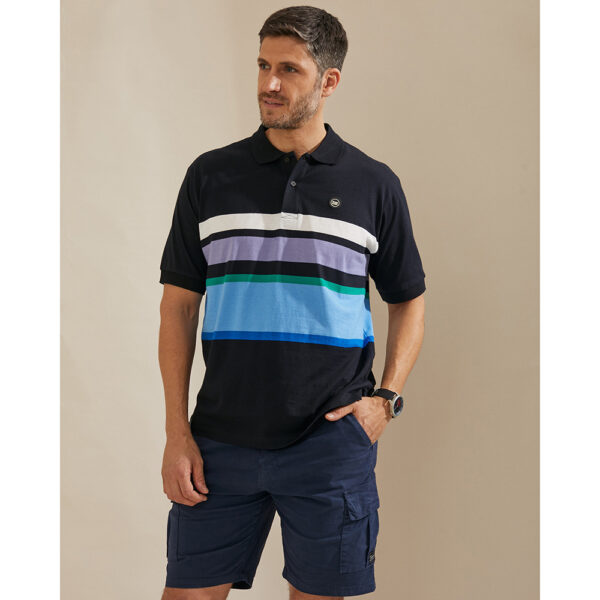 Chomba rayada en suave jersey de algodón. Calce regular fit y manga corta con puños que permiten un excelente ajuste. Presenta un cuello polo en un tejido de algodón con botones al tono y una grifa de goma de la marca en el pecho. Composición: 100% algodón.