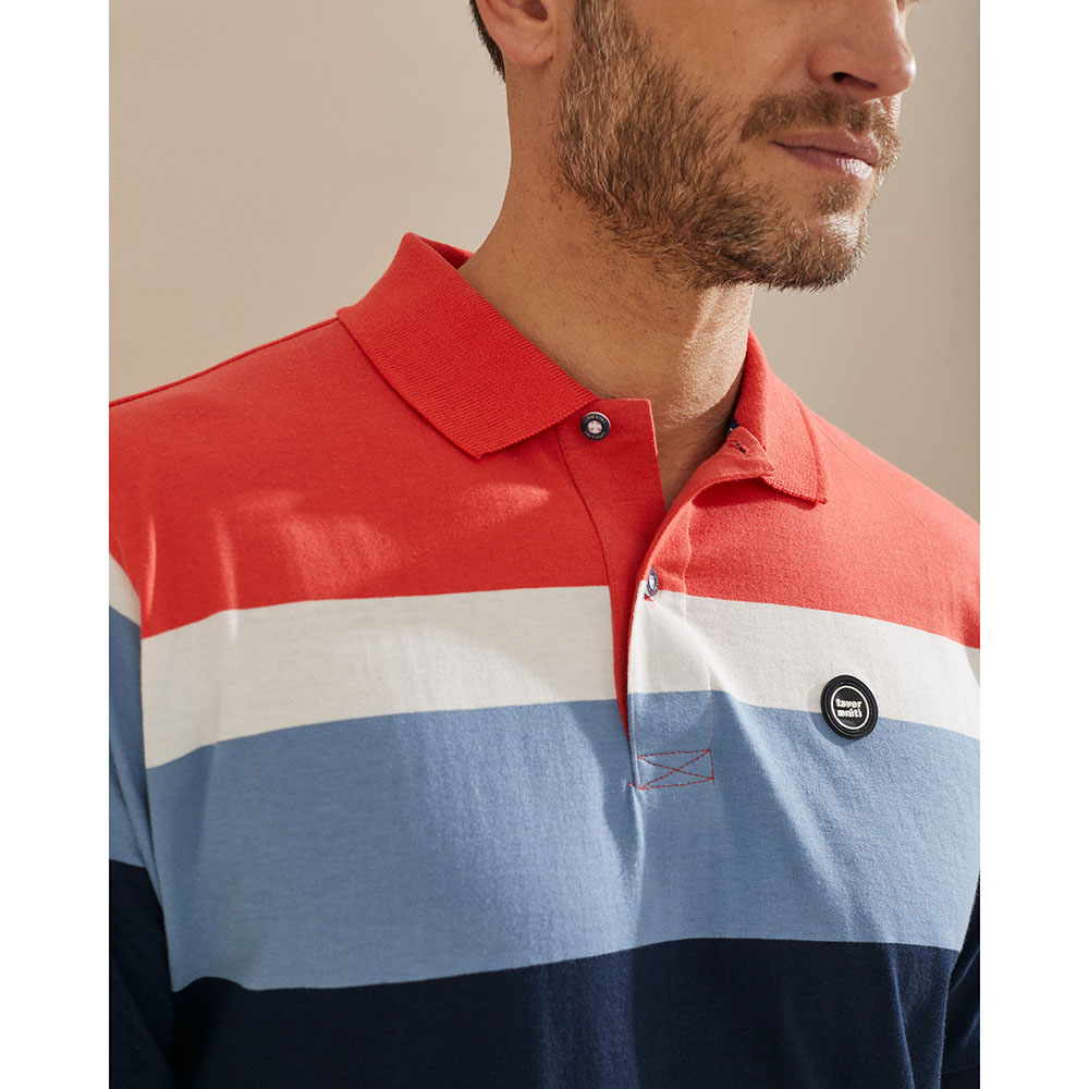 Chomba rayada en suave jersey de algodón. Calce regular fit y manga corta con puños que permiten un excelente ajuste. Presenta un cuello polo en un tejido de algodón con botones al tono y una grifa de goma de la marca en el pecho. Composición: 100% algodón.