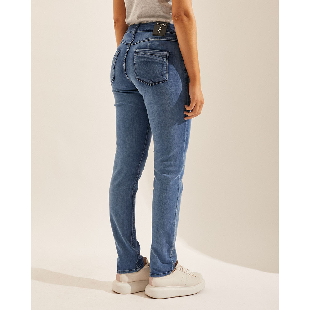 Jeans slim tiro alto elastizado 5 bolsillos. Detalle de bolsillo trasero con bordado y aplique. Elastizado. Composición: 98% algodón, 2% elastano.