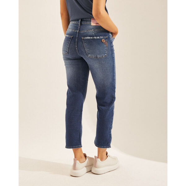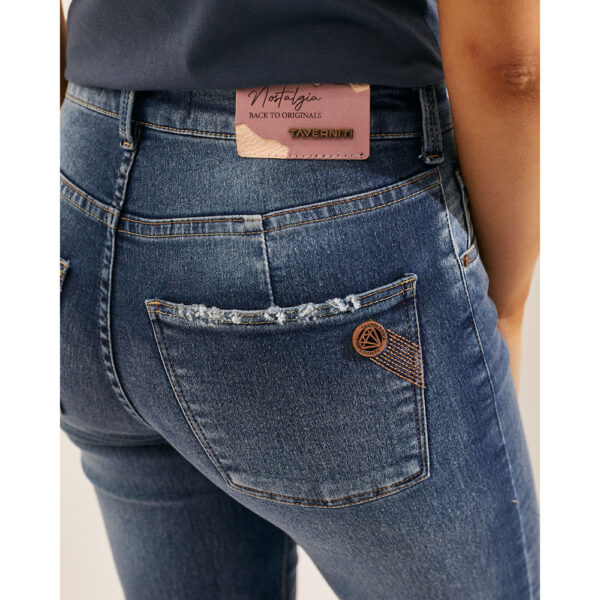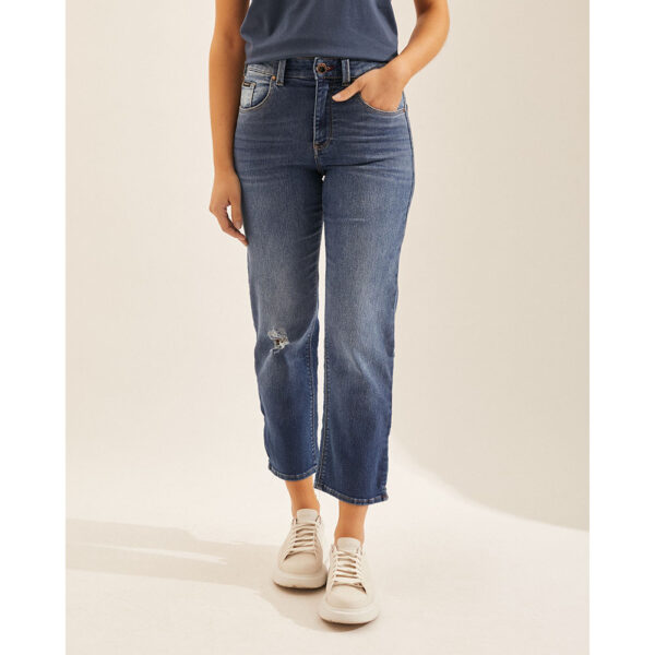 Jeans recto tiro intermedio 5 bolsillos. Detalle de chapa y bordado sobre bolsillo trasero. Confort. Composicion: 99% algodón, 1% elastano.