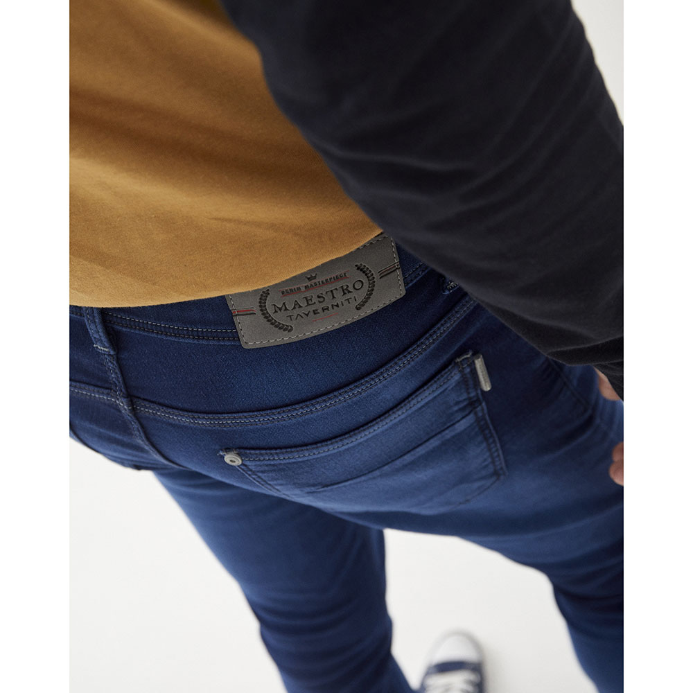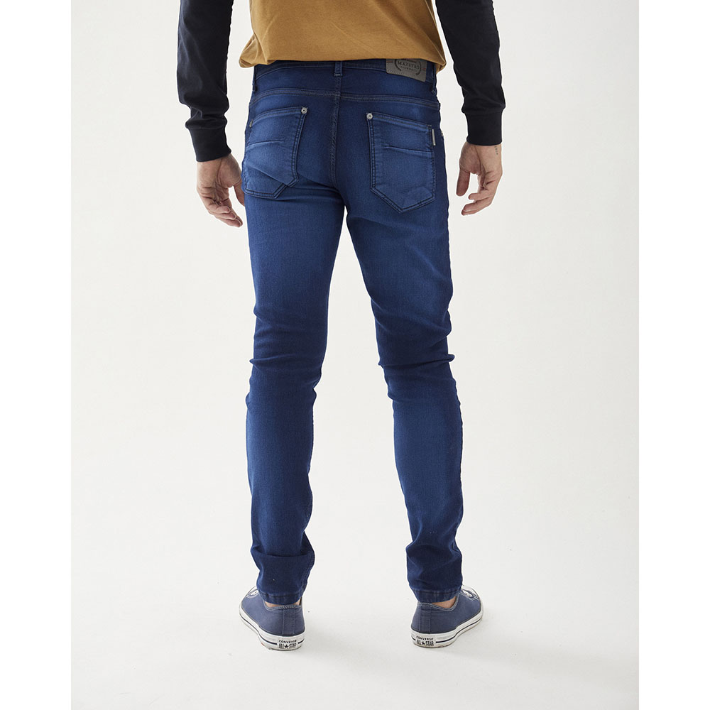 Jean tiro intermedio, calce slim. Bolsillos traseros pinza. Serie Maestro. •Elastizado• Composición: 98% algodón, 2% elastano.