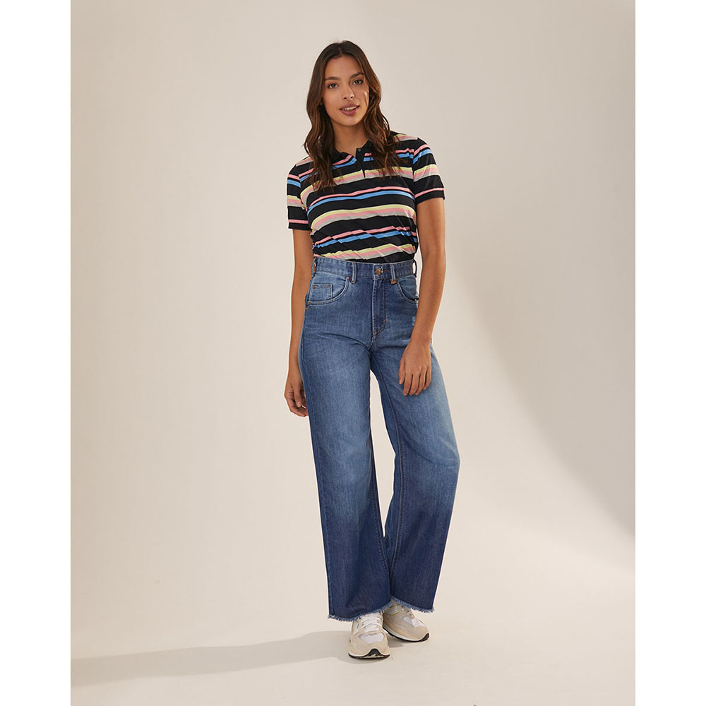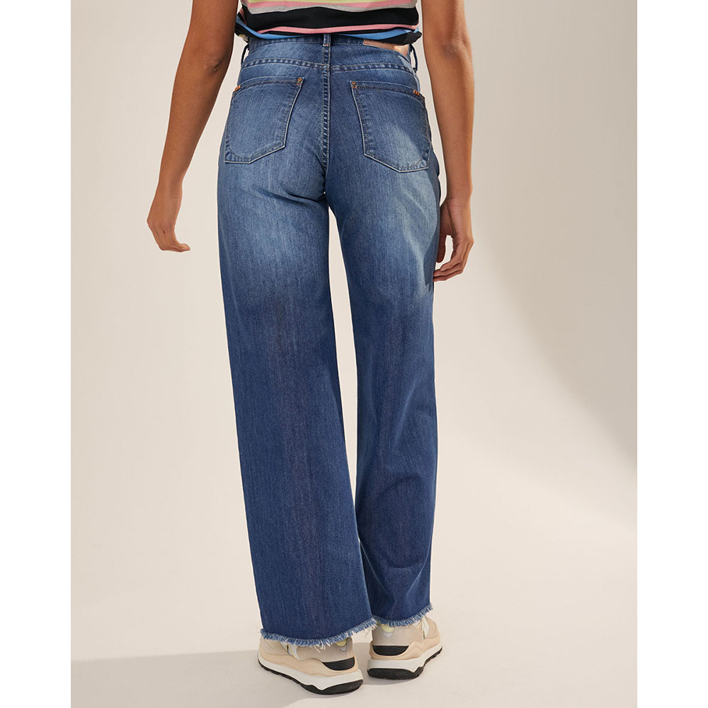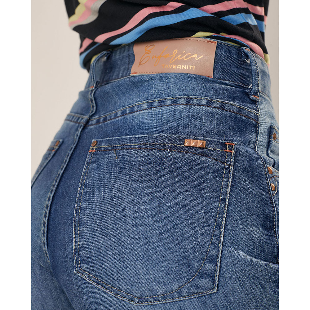 Jeans bota Wide inspirado en los años 70, tiro alto 5 bolsillos. Detalle de apliques en oro rojo. Linea Euforica. Rigido. Composicion: 100% algodón.