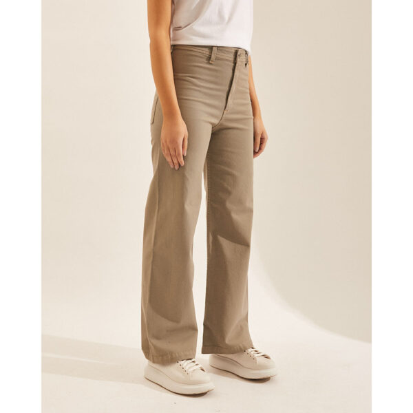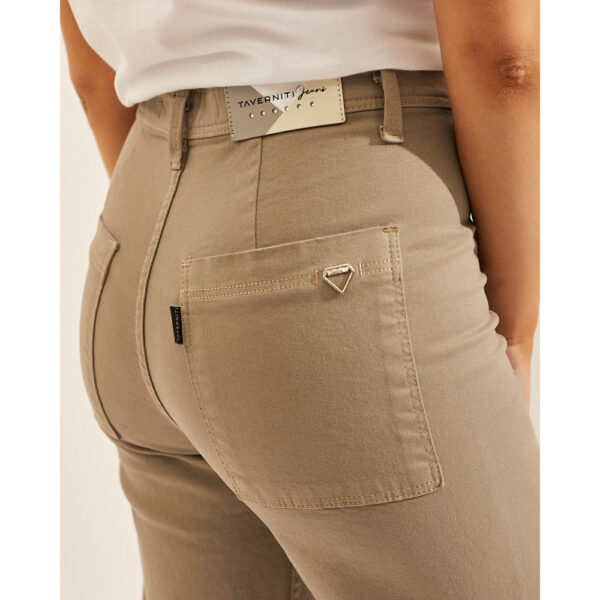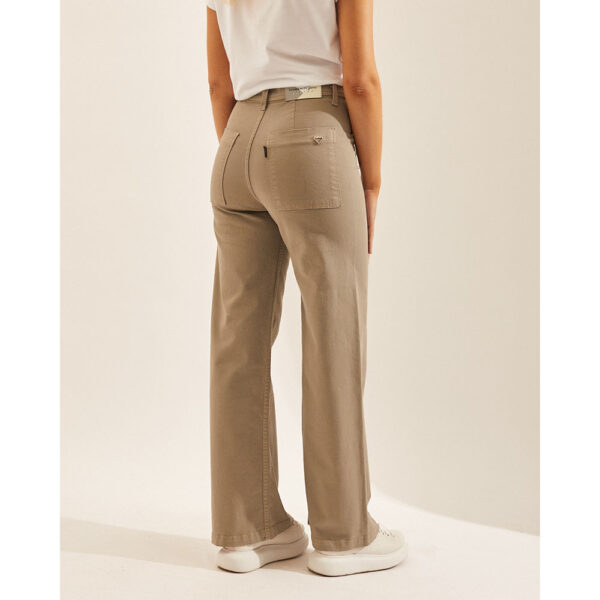 Pantalón Tiro Alto elastizado color. Bota holgada. Detalle de bordados sobre bolsillos traseros. Composición: 98% Algodón, 2% Elastano.