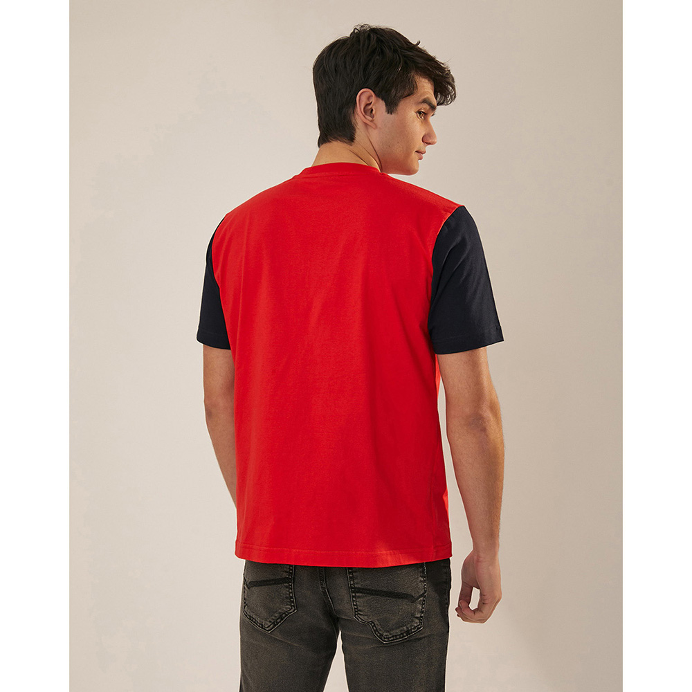 Remera estampada de jersey de algodón, calce regular fit, manga corta, y escote redondo con cuello en tejido elastizado. Presenta las mangas a contratono y una estampa central en el delantero.