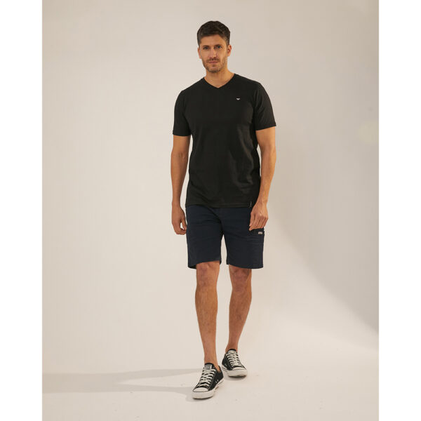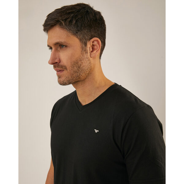 Remera básica de jersey de algodón gamuzado. Calce regular, manga corta y escote en V, con cuello en tejido elastizado. Lleva un logotipo bordado en el pecho.