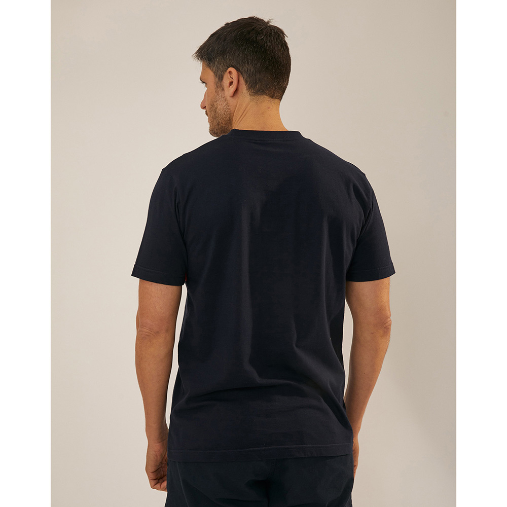 Remera estampada de jersey de algodón, calce regular fit, manga corta, y escote redondo con cuello en tejido elastizado. Lleva el cuello y el recorte central a contratono y una estampa institucional en el frente. Composición 100% algodón.