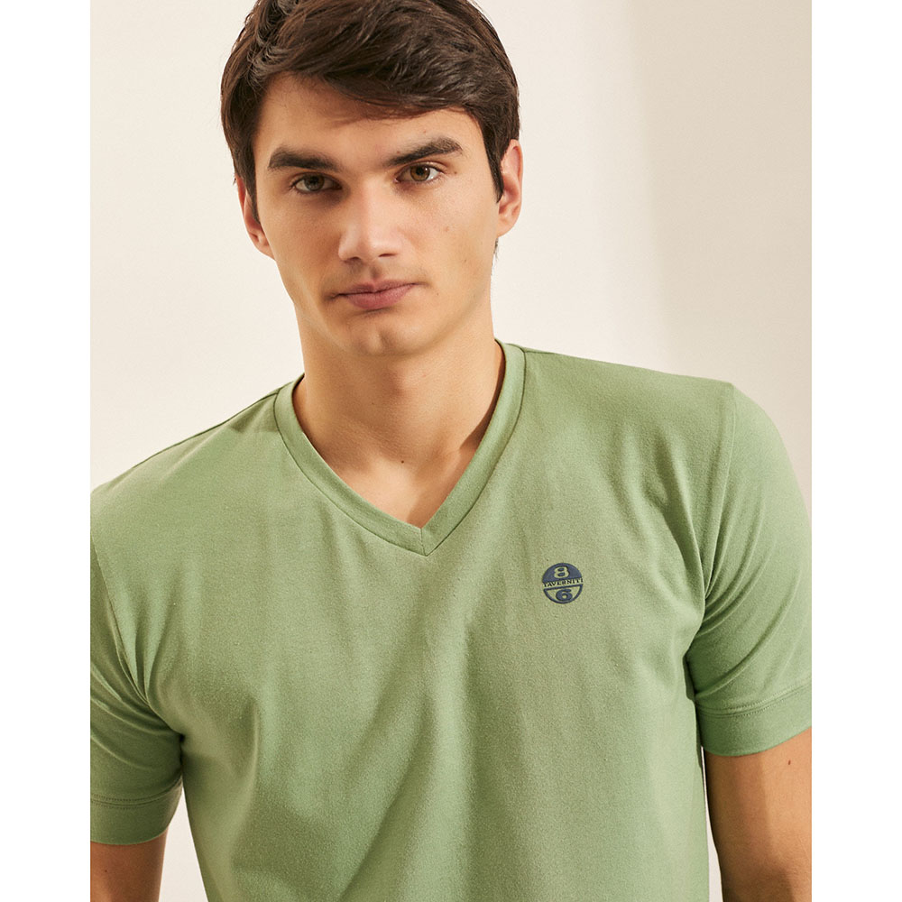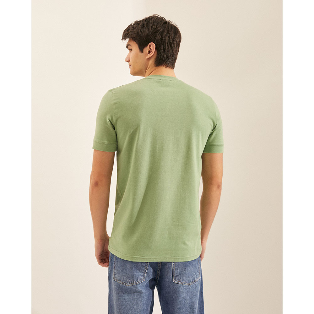 Remera básica en tejido elastizado de algodón con lycra. Calce slim fit, manga corta y escote en V. Posee puños anchos que permiten un perfecto ajuste en las mangas y un logo estampado con textura en relieve en el pecho.