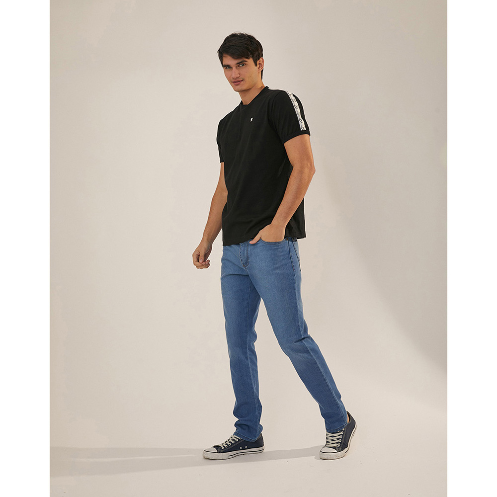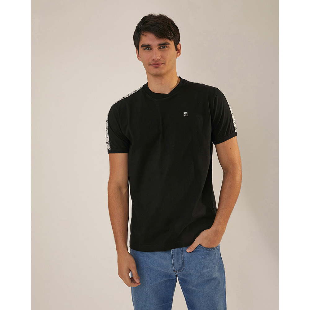 Remera de jersey de algodón, calce regular fit, manga corta, y escote redondo con cuello en tejido elastizado. Lleva una cinta tejida personalizada en las mangas y un logo en el pecho. Composición 100% algodón.