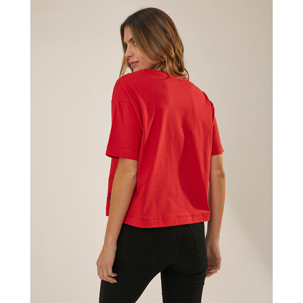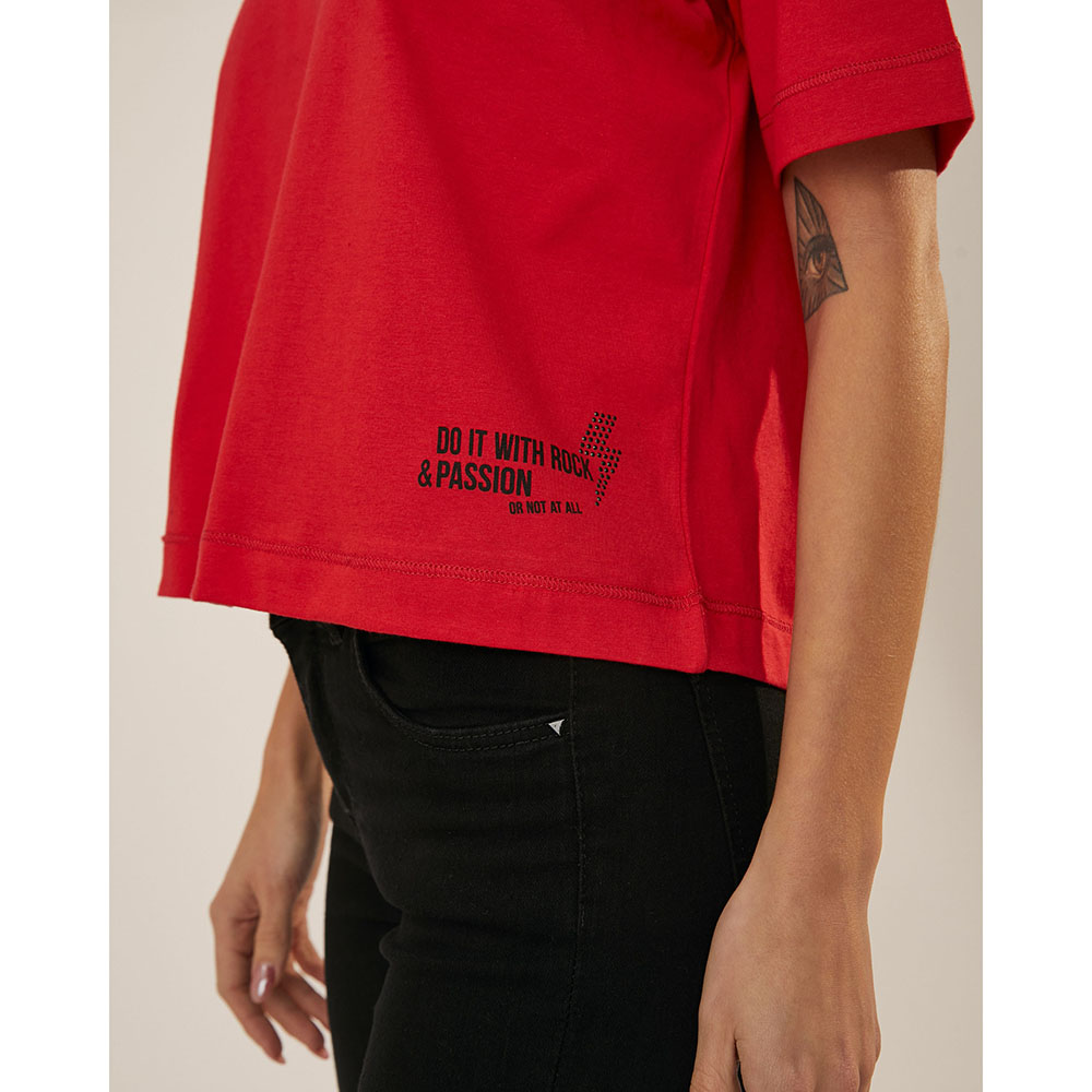 Remera corta cuello redondo en ribb, silueta relajada y manga por encima del codo en jersey liviano de algodón. Tejido de mano extra suave y fresca. Detalle de ruedos anchos con costura bordador al tono. Estampado rock con rayo de piedras facetada.