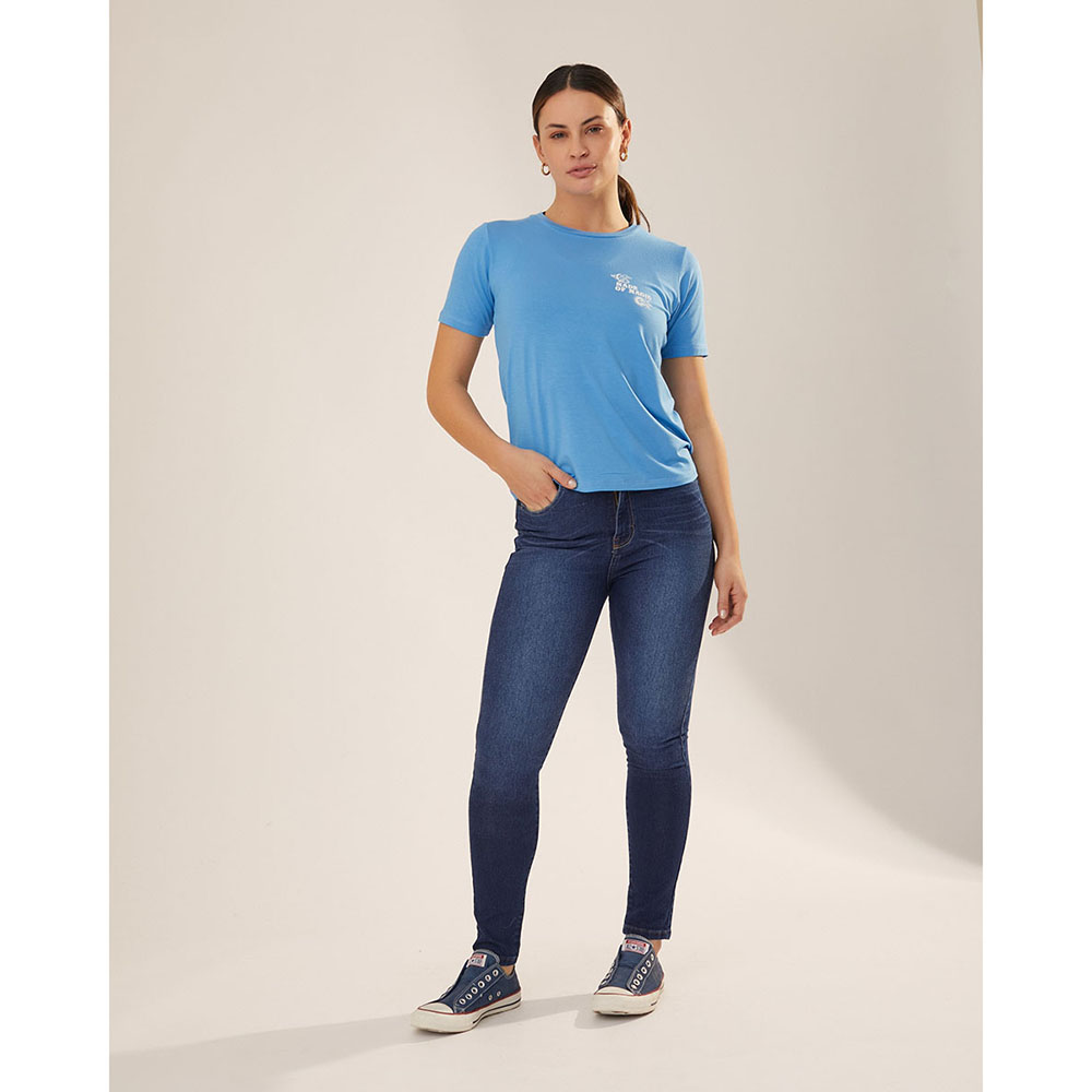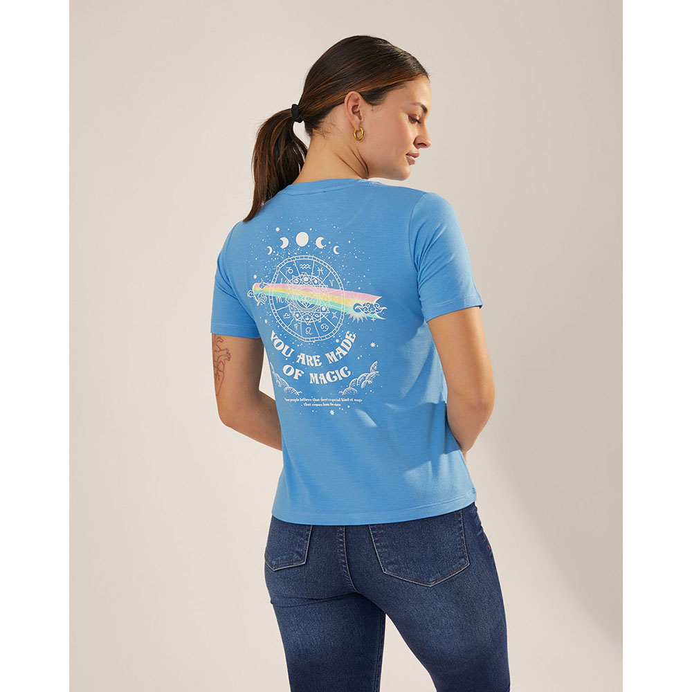 Remera básica cuello redondo y manga corta en jersey de bambú elastizado. Fibra 100% natural, orgánica, antibacteriana y además antiadherente. Estampado composición lunar con estrella fugaz arco iris versión logo en delantero y central en espalda.
