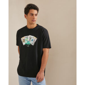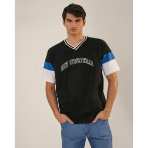Remera estampada de jersey de algodón liviano de estilo urbano deportivo. De calce regular fit, manga corta y escote redondo con cuello en tejido elastizado. Lleva una estampa central en el delantero y otra en la manga derecha.