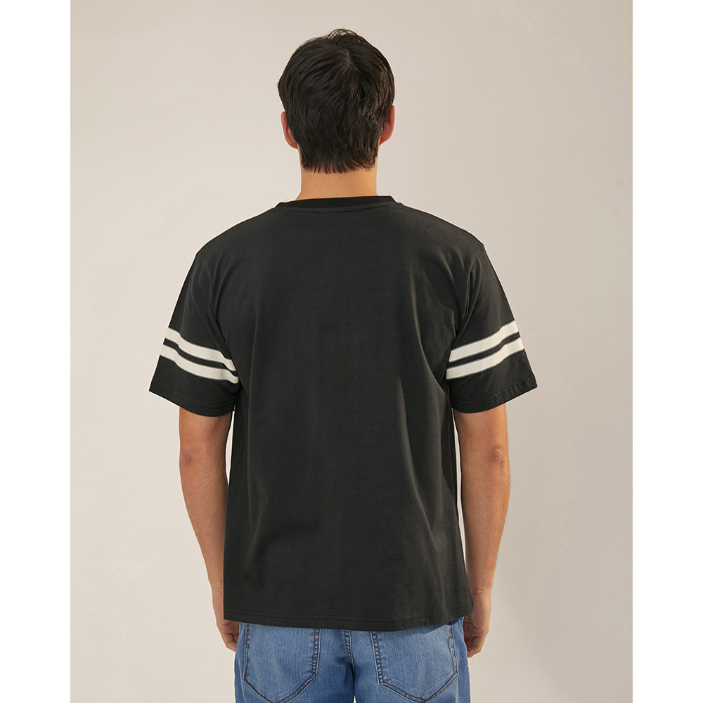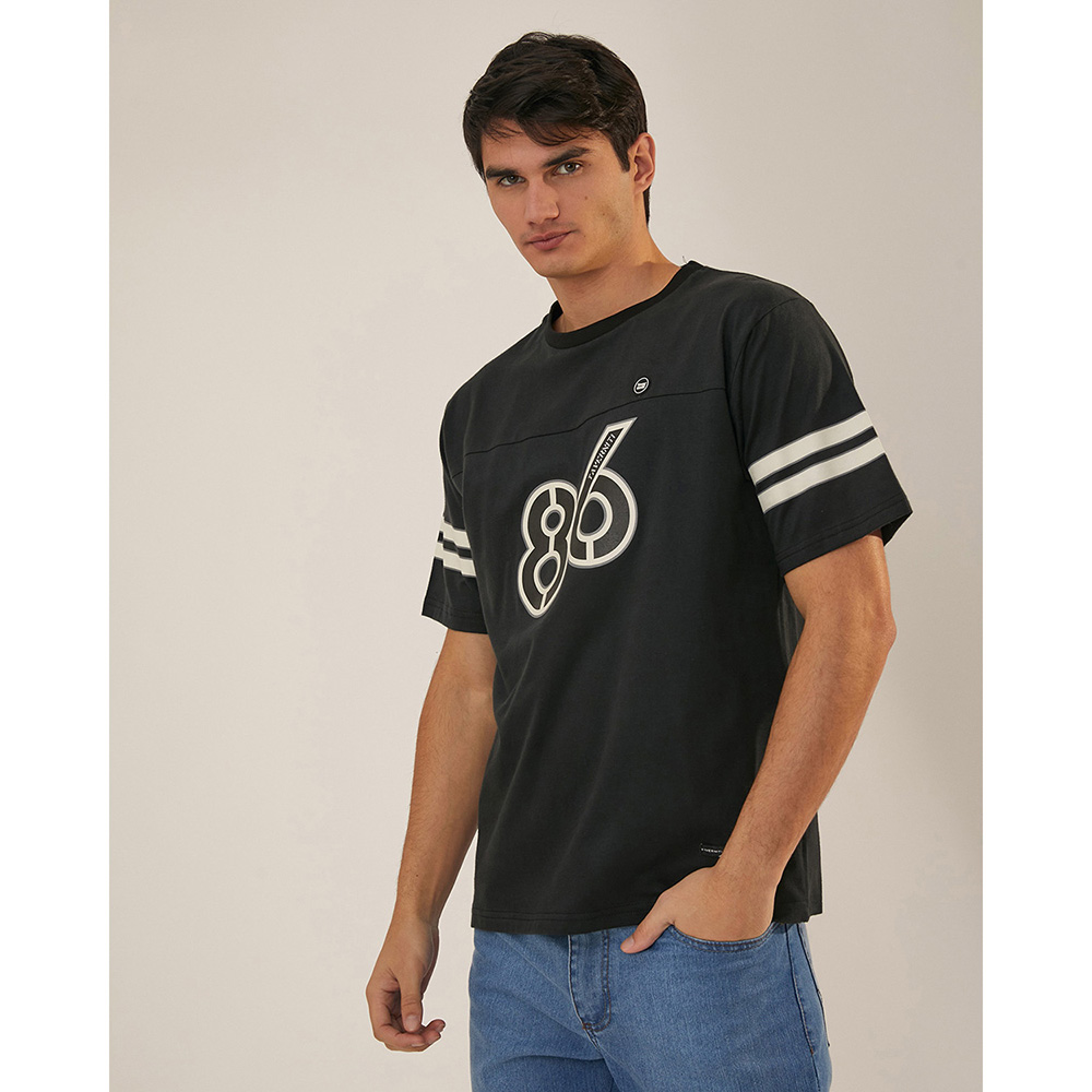 Remera oversize confeccionada en jersey de algodón, manga corta y escote redondo con cuello en tejido elastizado. Lleva un recorte en el delantero a la altura del pecho y presenta estampado el delantero y las mangas. Composición 100% algodón.
